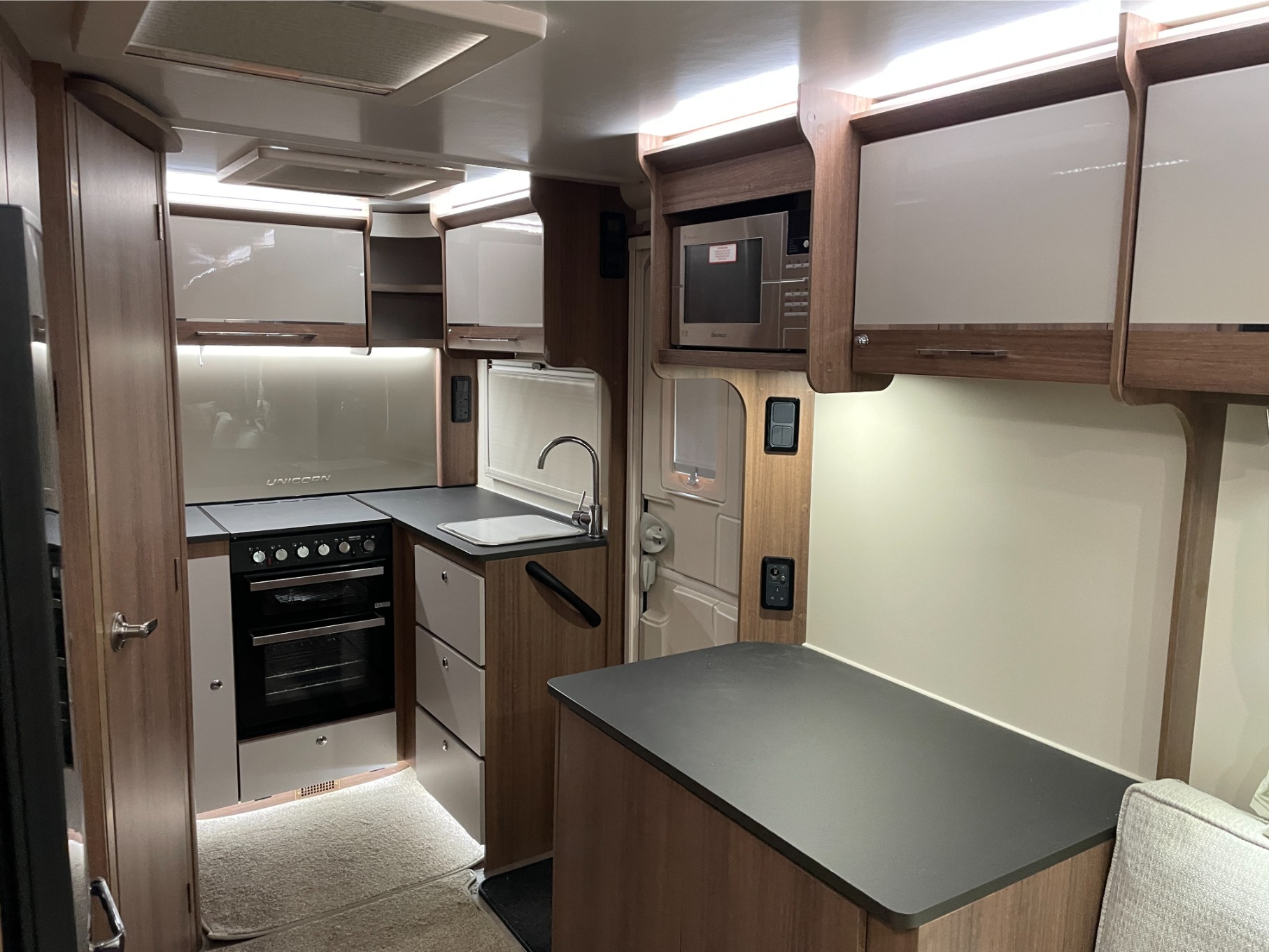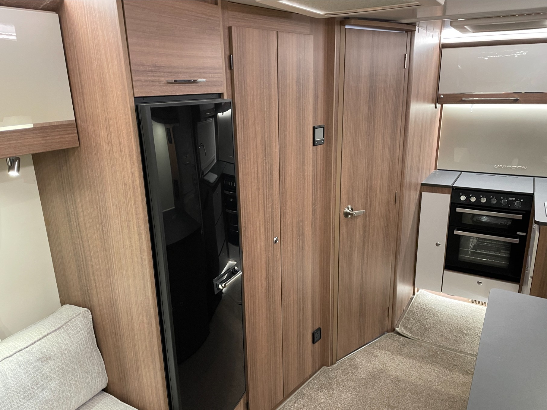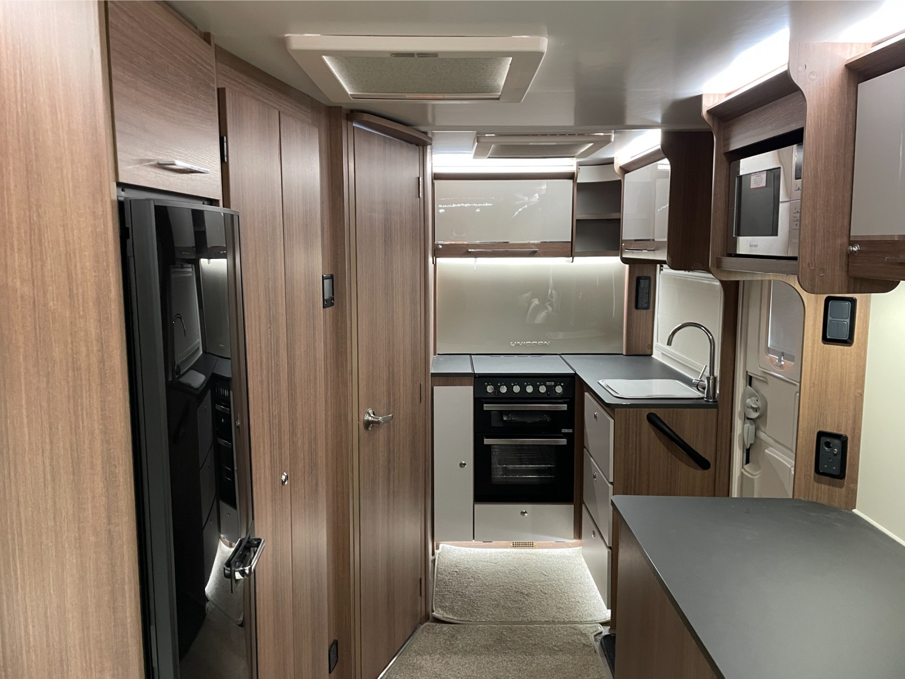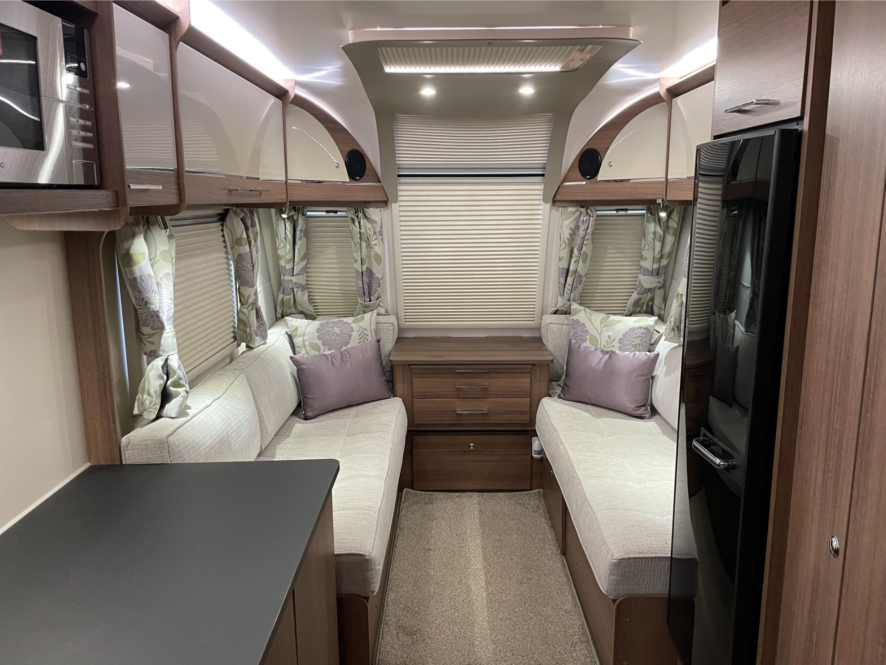 Built with Bailey’s Alu-Tech bodyshell for durability and thermal performance, the Seville includes the sought-after ALDE wet central heating system, ensuring cosy year-round touring. The fully equipped kitchen includes a dual-fuel hob, microwave, and large fridge, making meal prep a breeze wherever you travel.