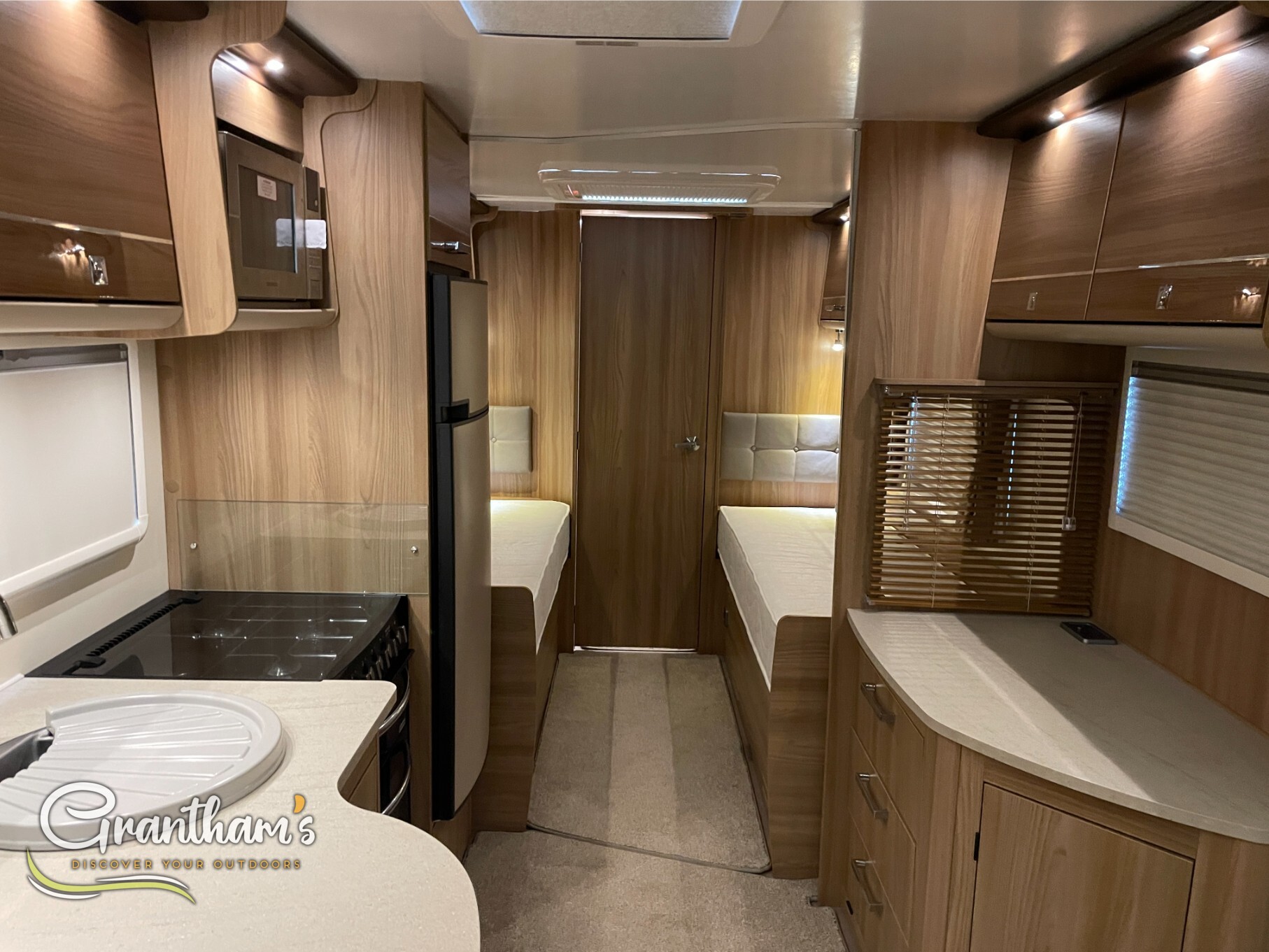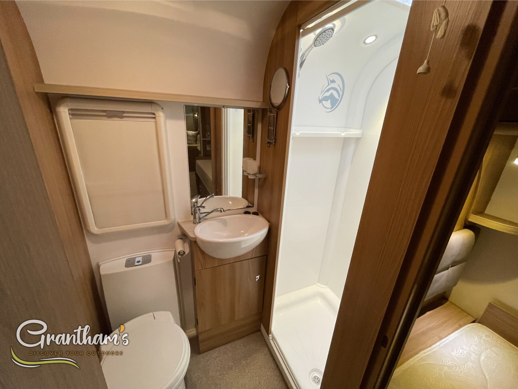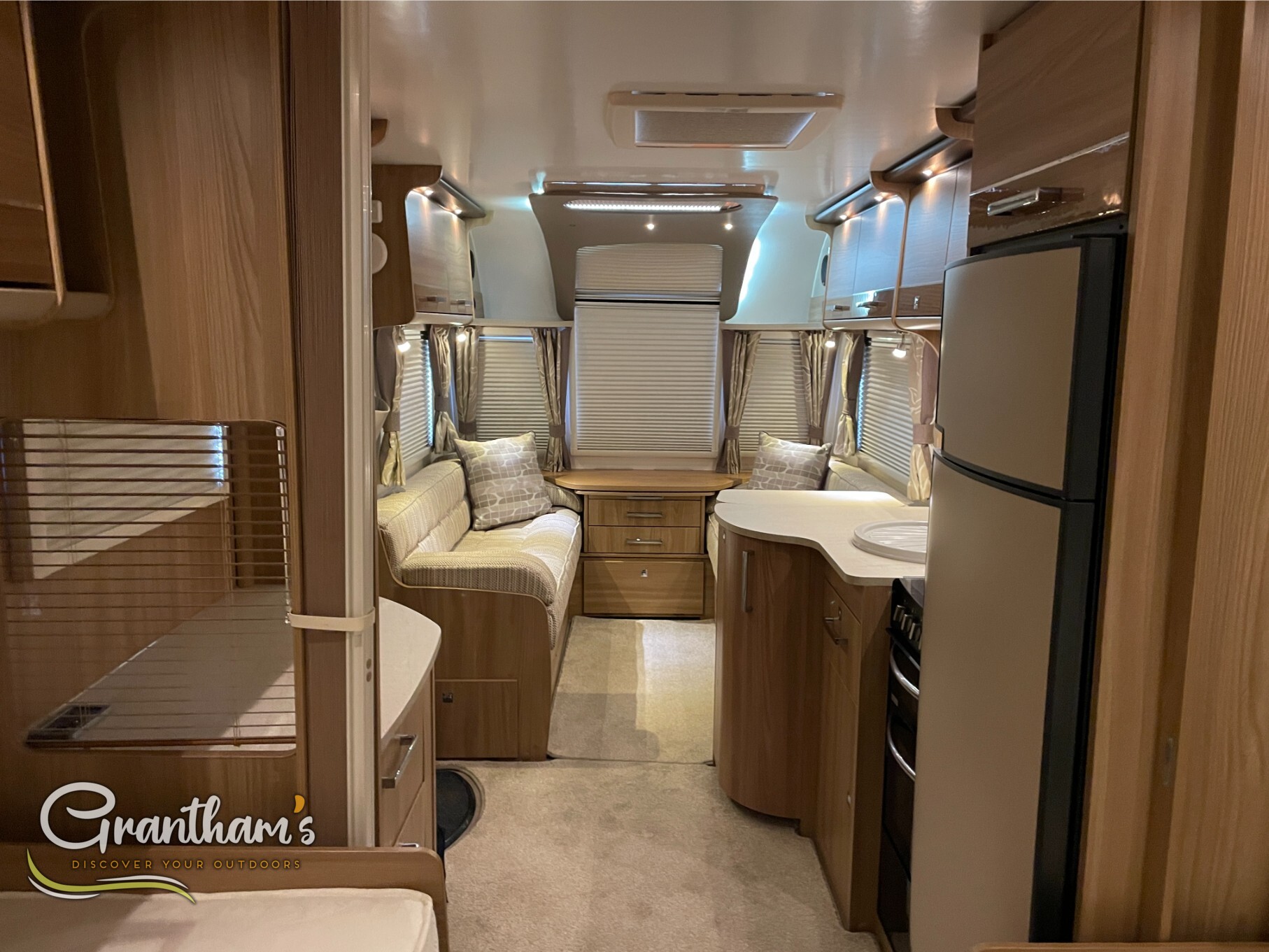 Inside, you’ll find a well-appointed kitchen, a generous lounge area that converts into a second double bed, and the standout feature – a full-width rear washroom with a separate shower and ample storage. Stay cosy all year round with the ALDE wet central heating system, providing consistent warmth just like at home.