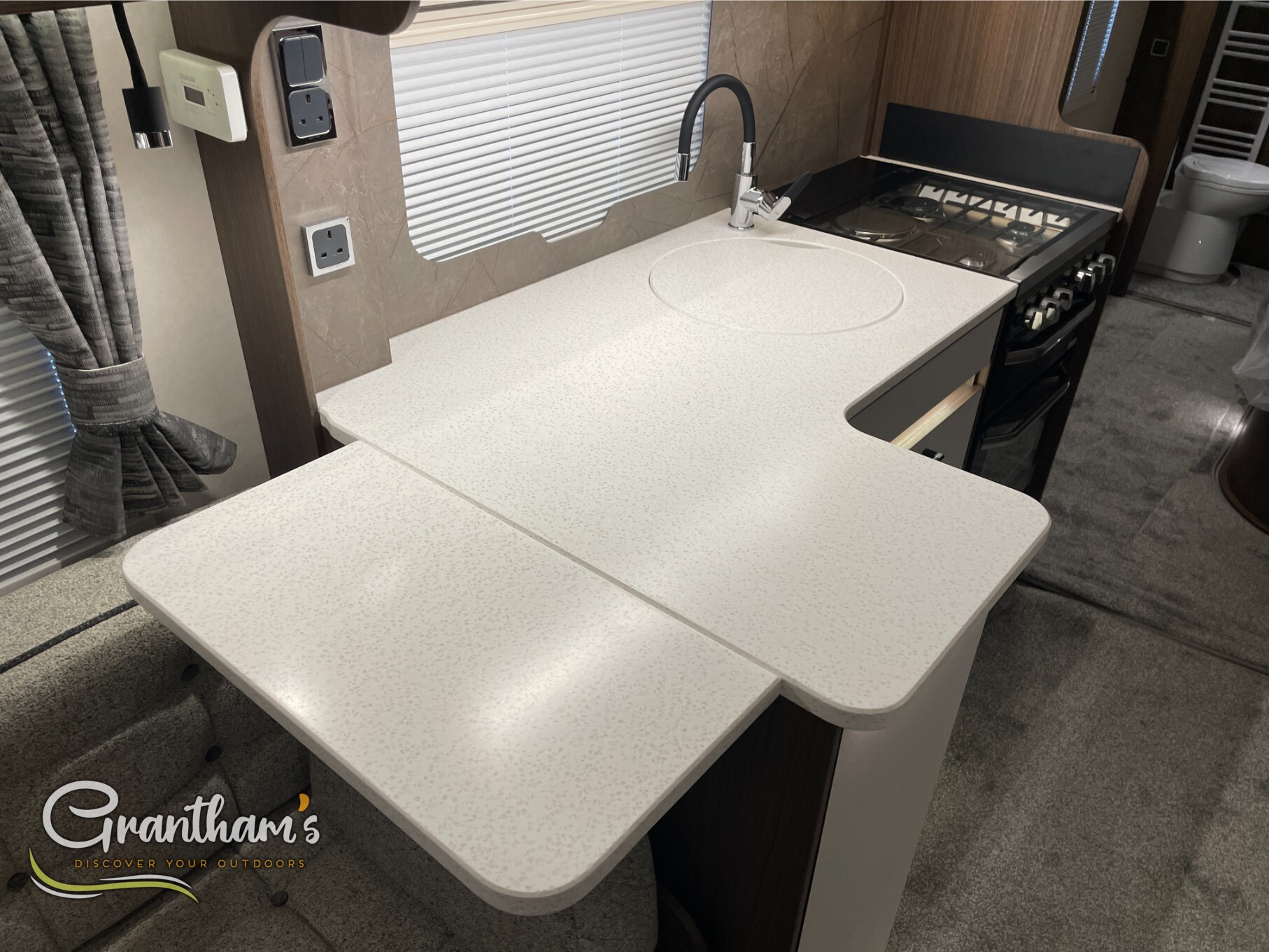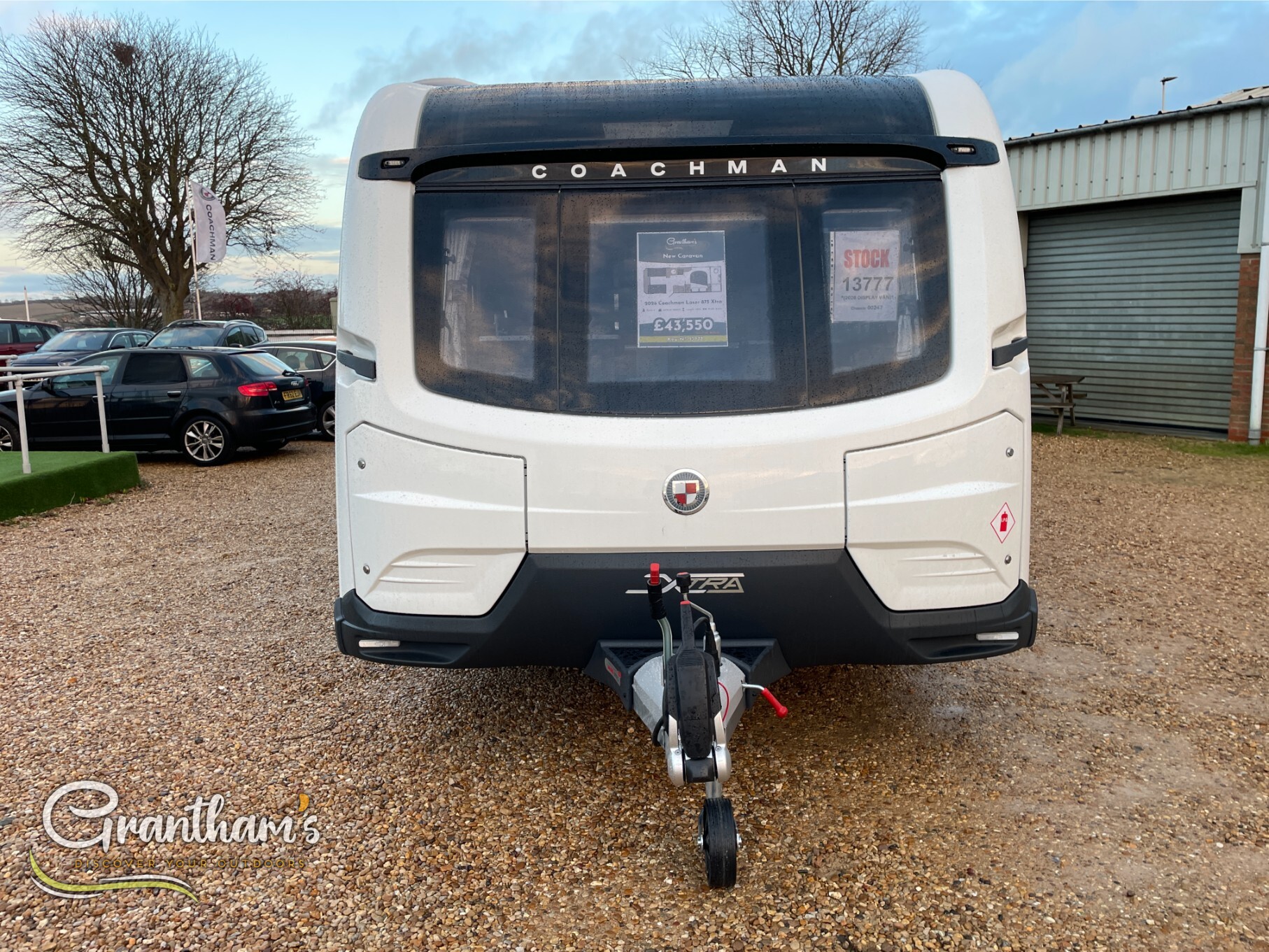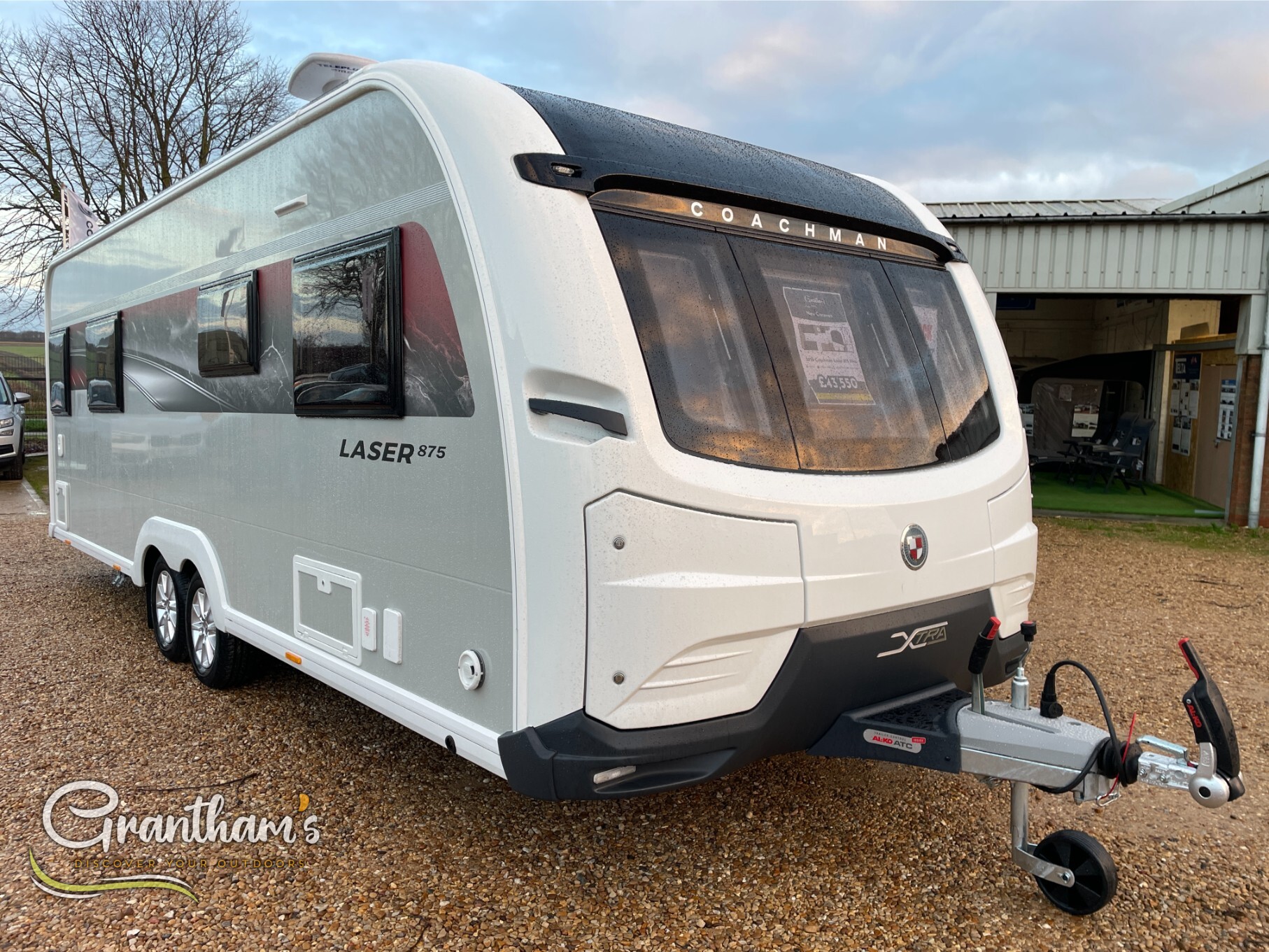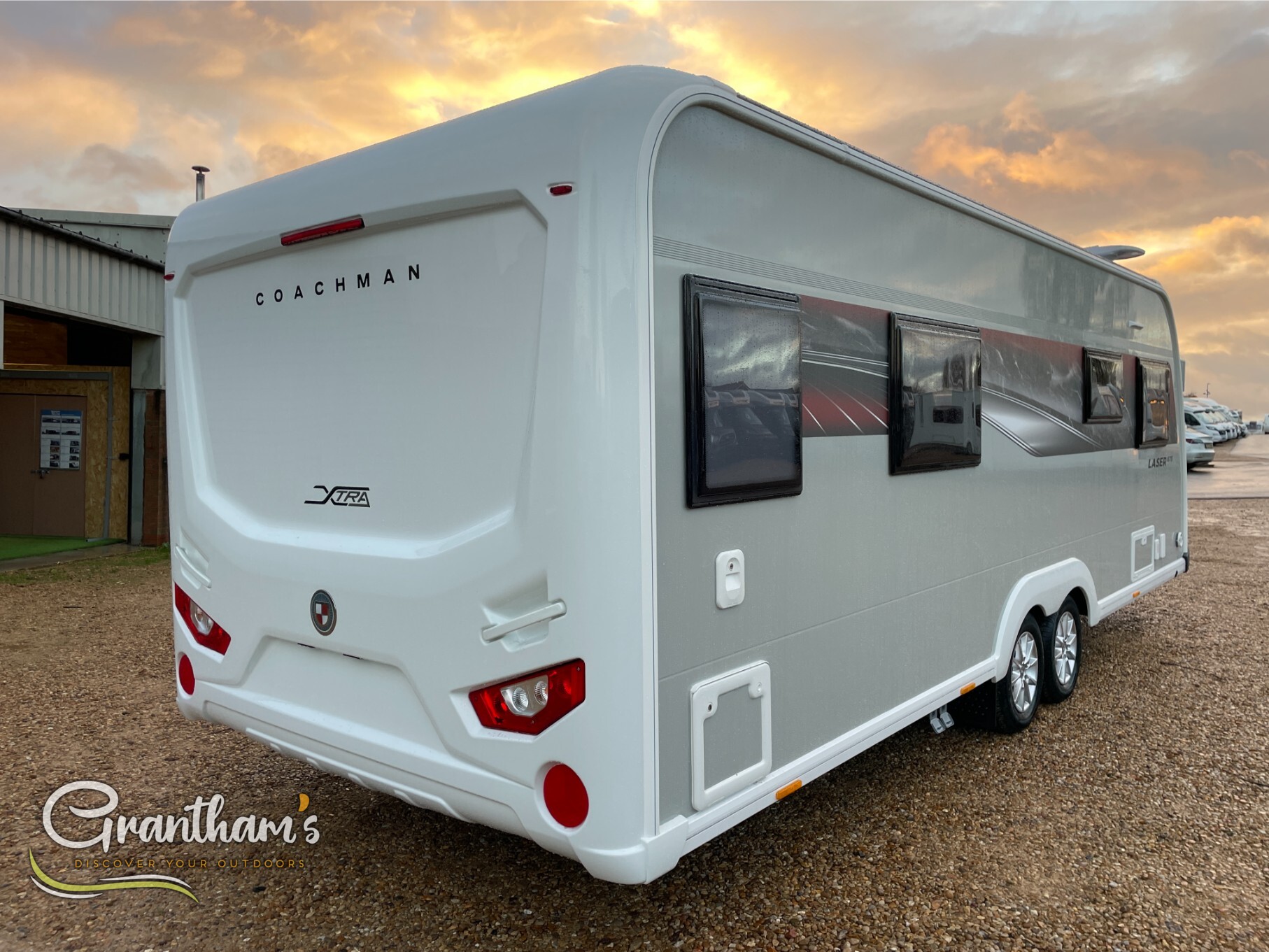 The Coachman Laser 875 Xtra. It’s the more spacious sister of the best selling model the Laser 575 Xtra… What makes it more spacious, well it’s on a twin axle chassis giving it more length allowing for extra luxuries such as a longer kitchen worktop space, extra worktop space near the door with the addition of a under counter storage locker, slightly more worktop space on the corner unit in the bedroom, and of course more floor space. The popular transverse island bed, end washroom layout but bigger.
