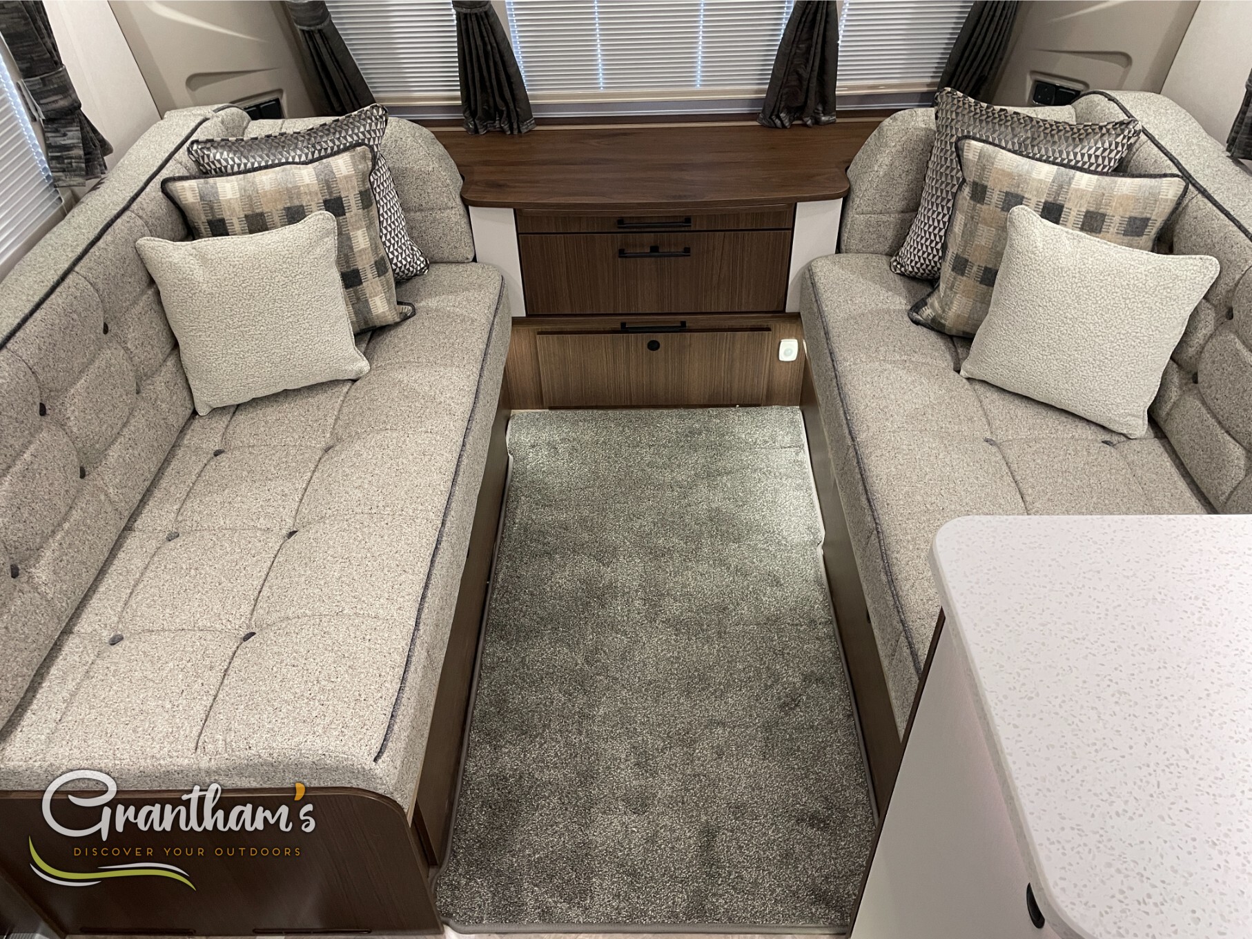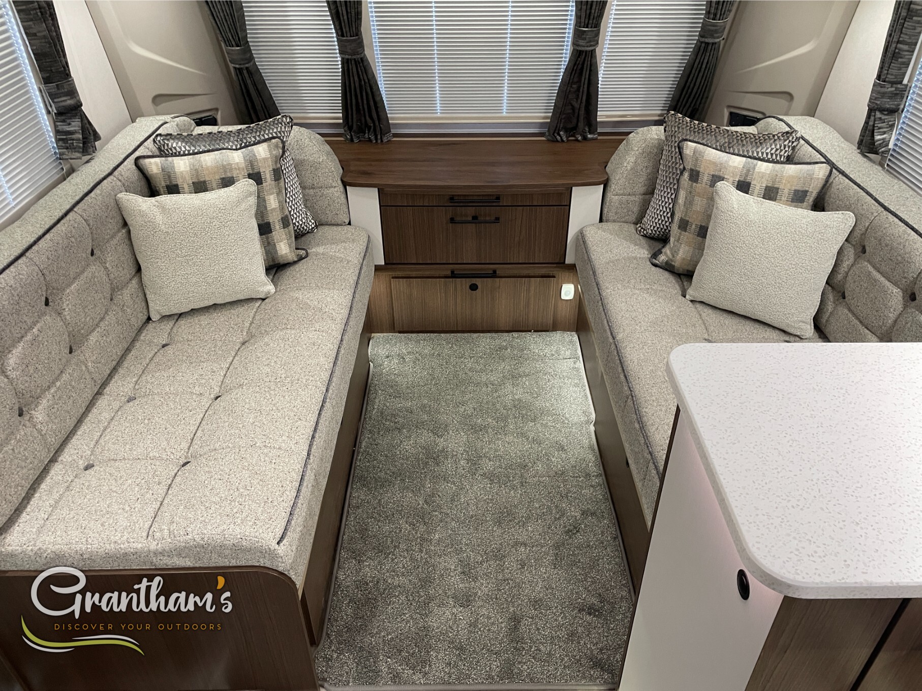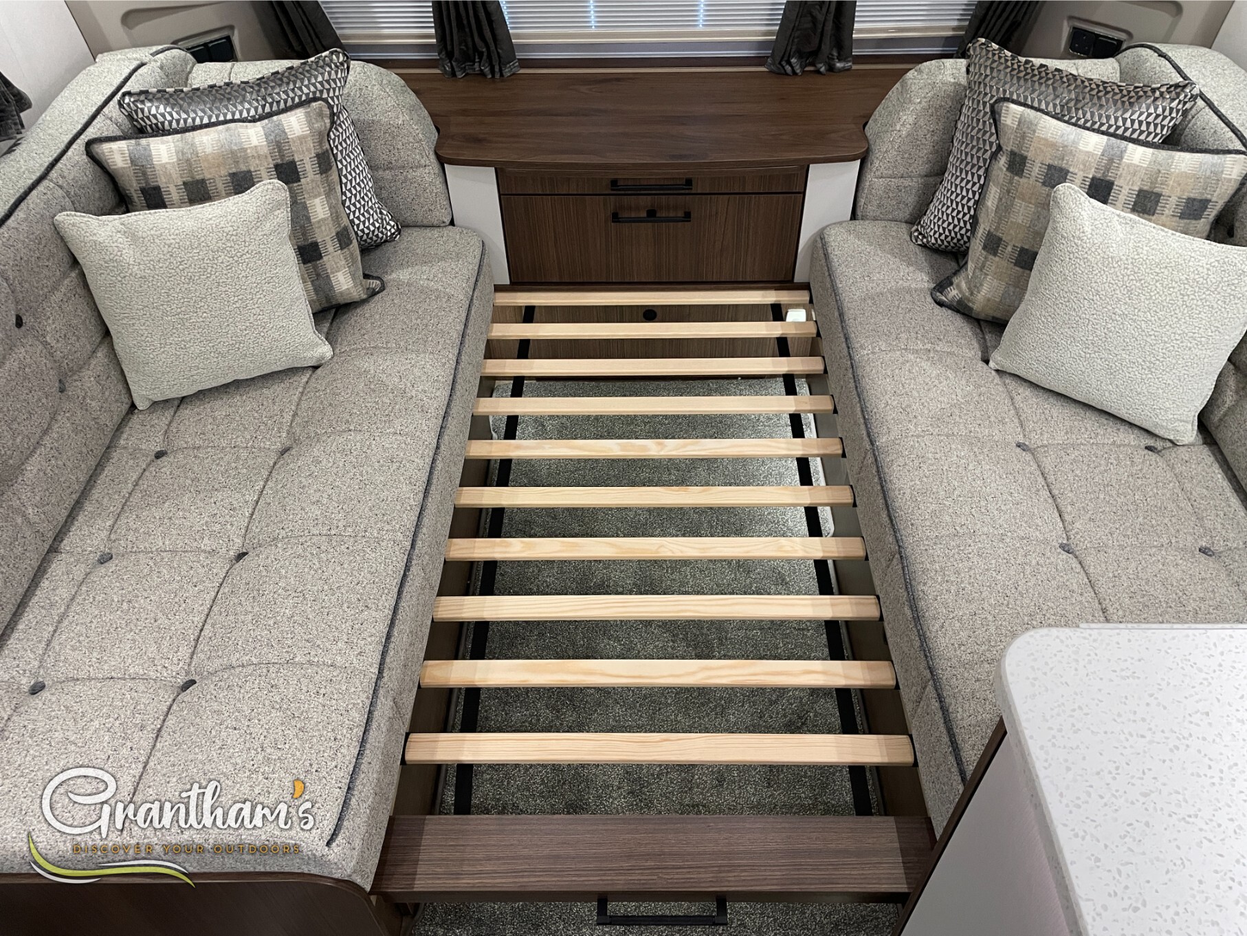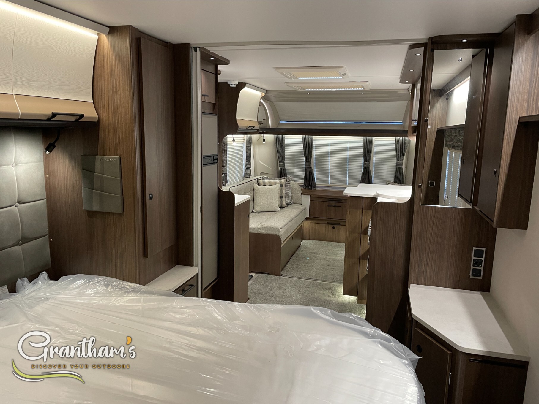 The Coachman Laser 875 Xtra. It’s the more spacious sister of the best selling model the Laser 575 Xtra… What makes it more spacious, well it’s on a twin axle chassis giving it more length allowing for extra luxuries such as a longer kitchen worktop space, extra worktop space near the door with the addition of a under counter storage locker, slightly more worktop space on the corner unit in the bedroom, and of course more floor space. The popular transverse island bed, end washroom layout but bigger.