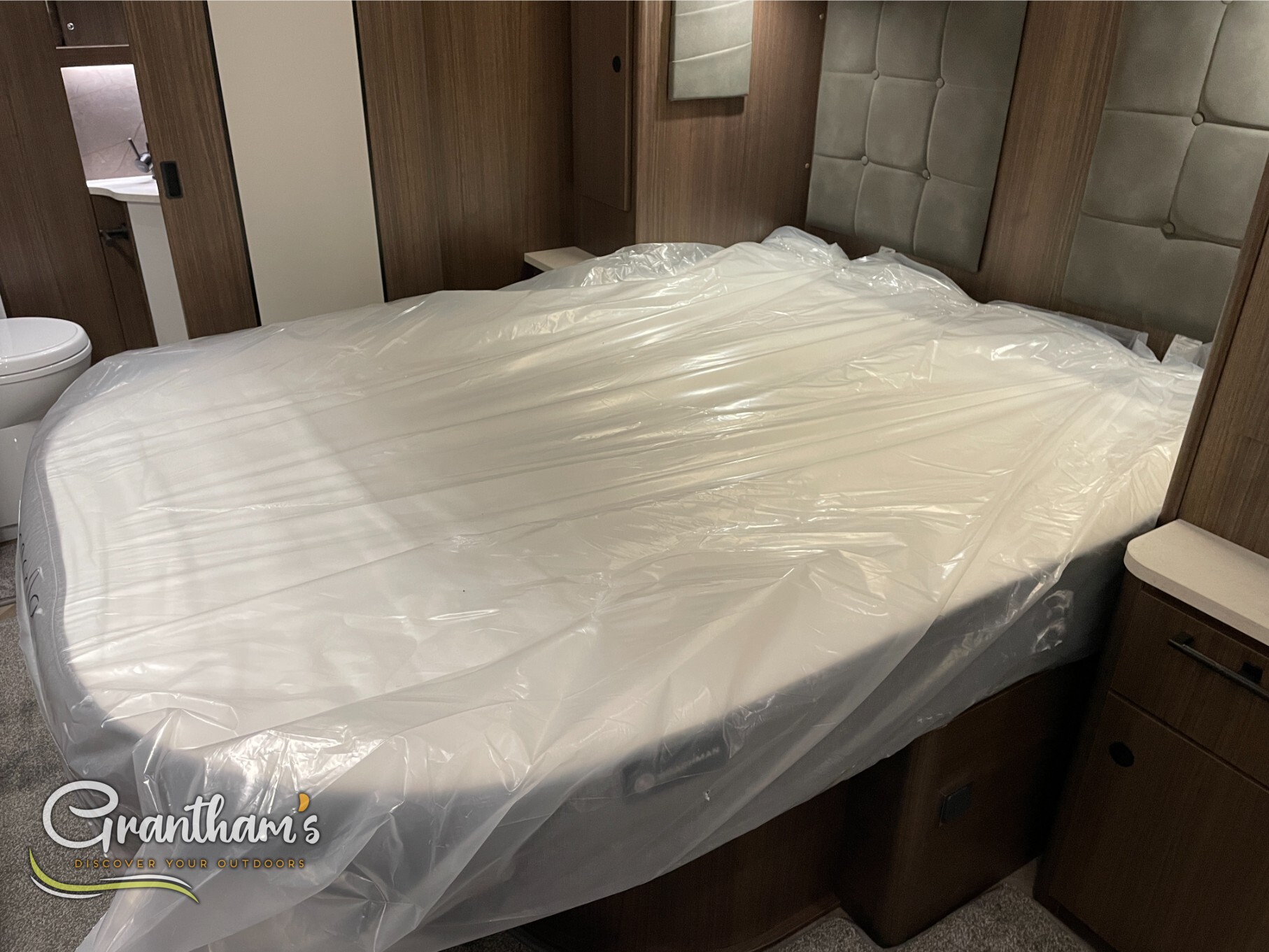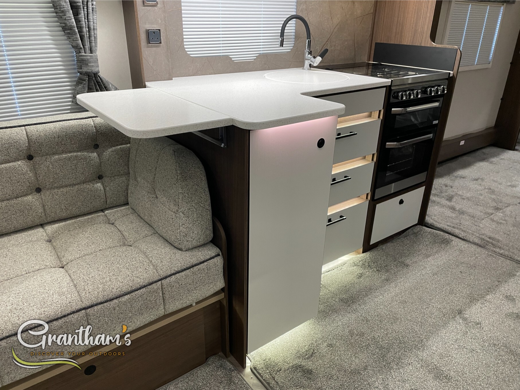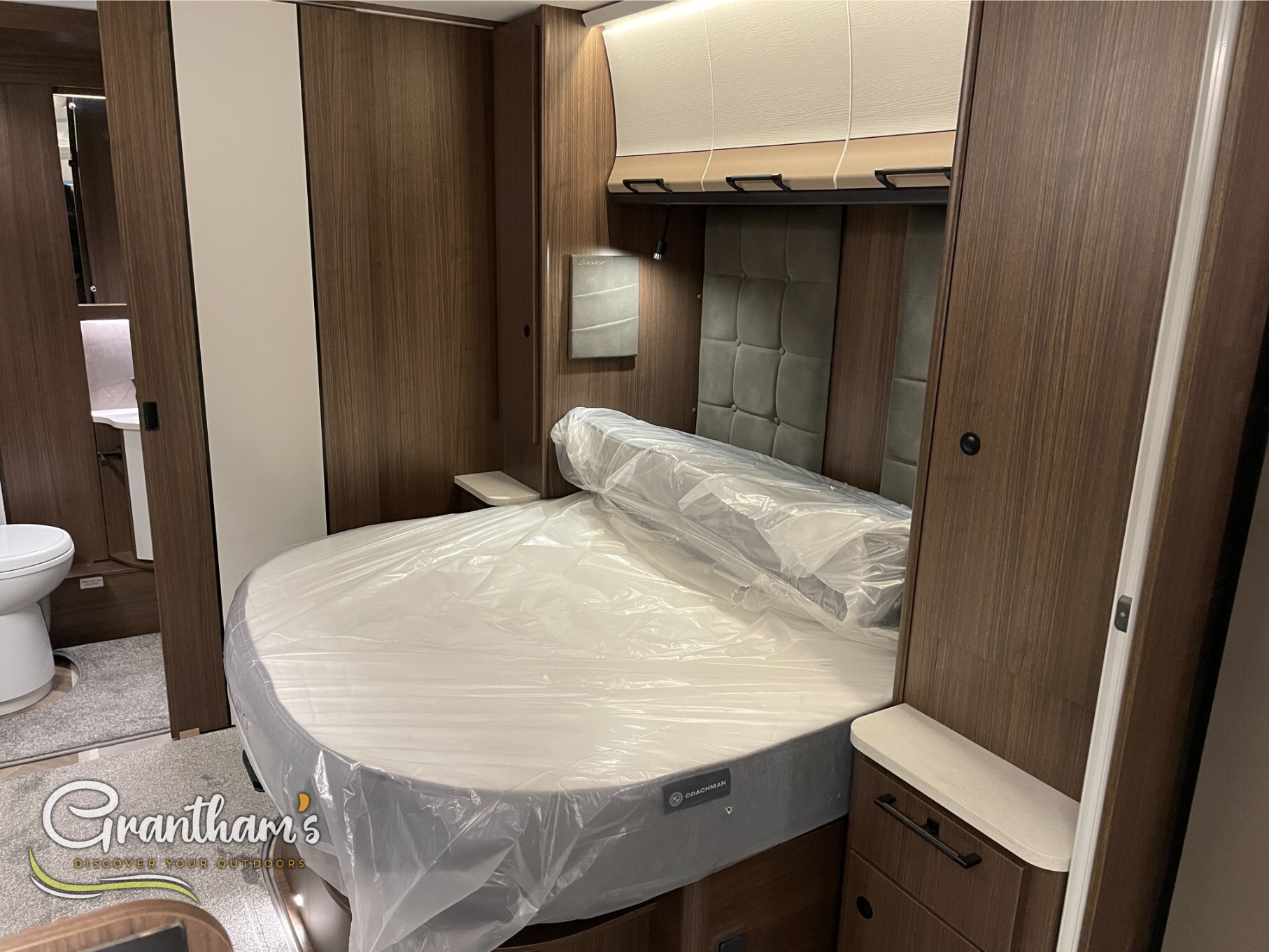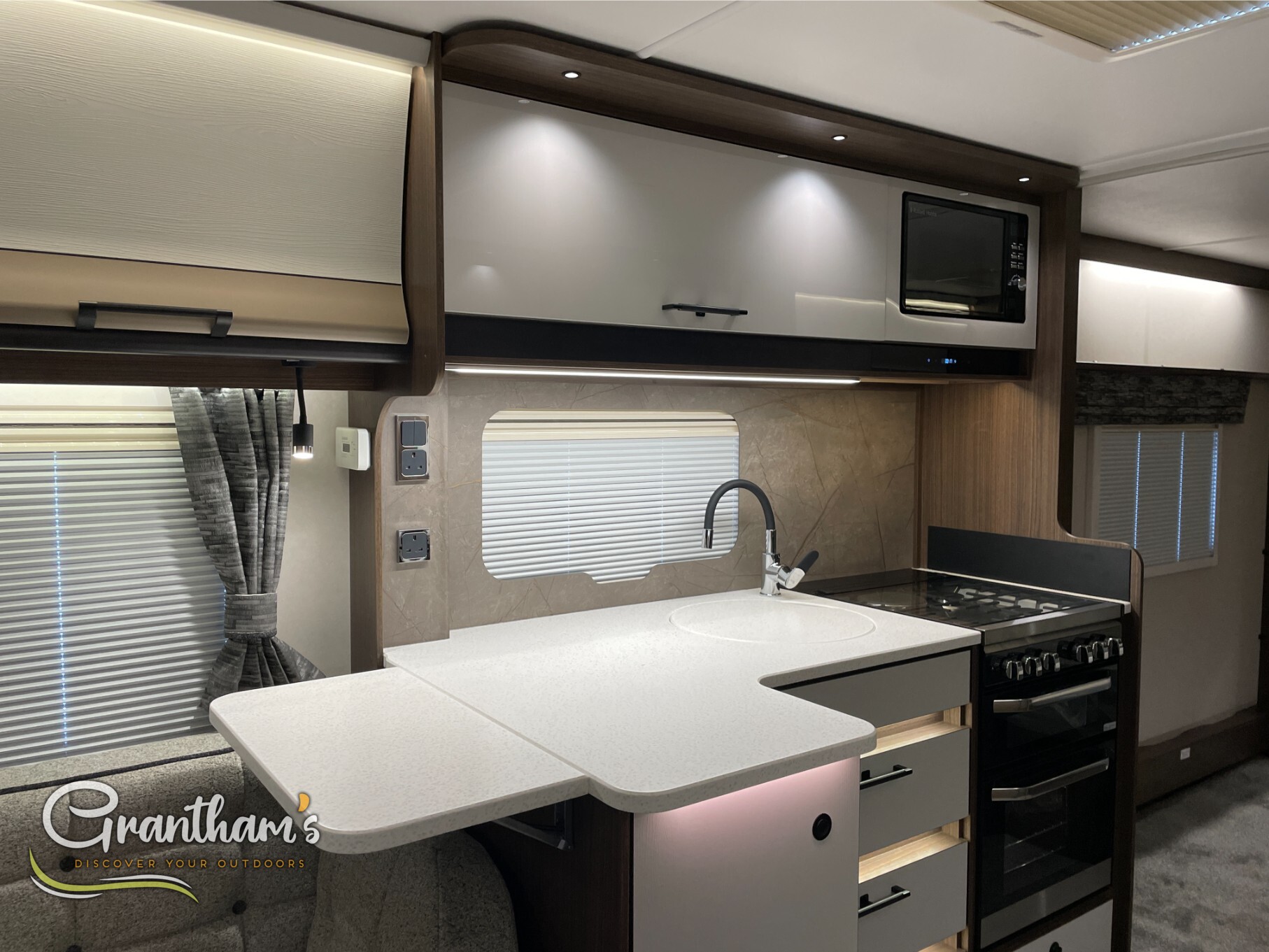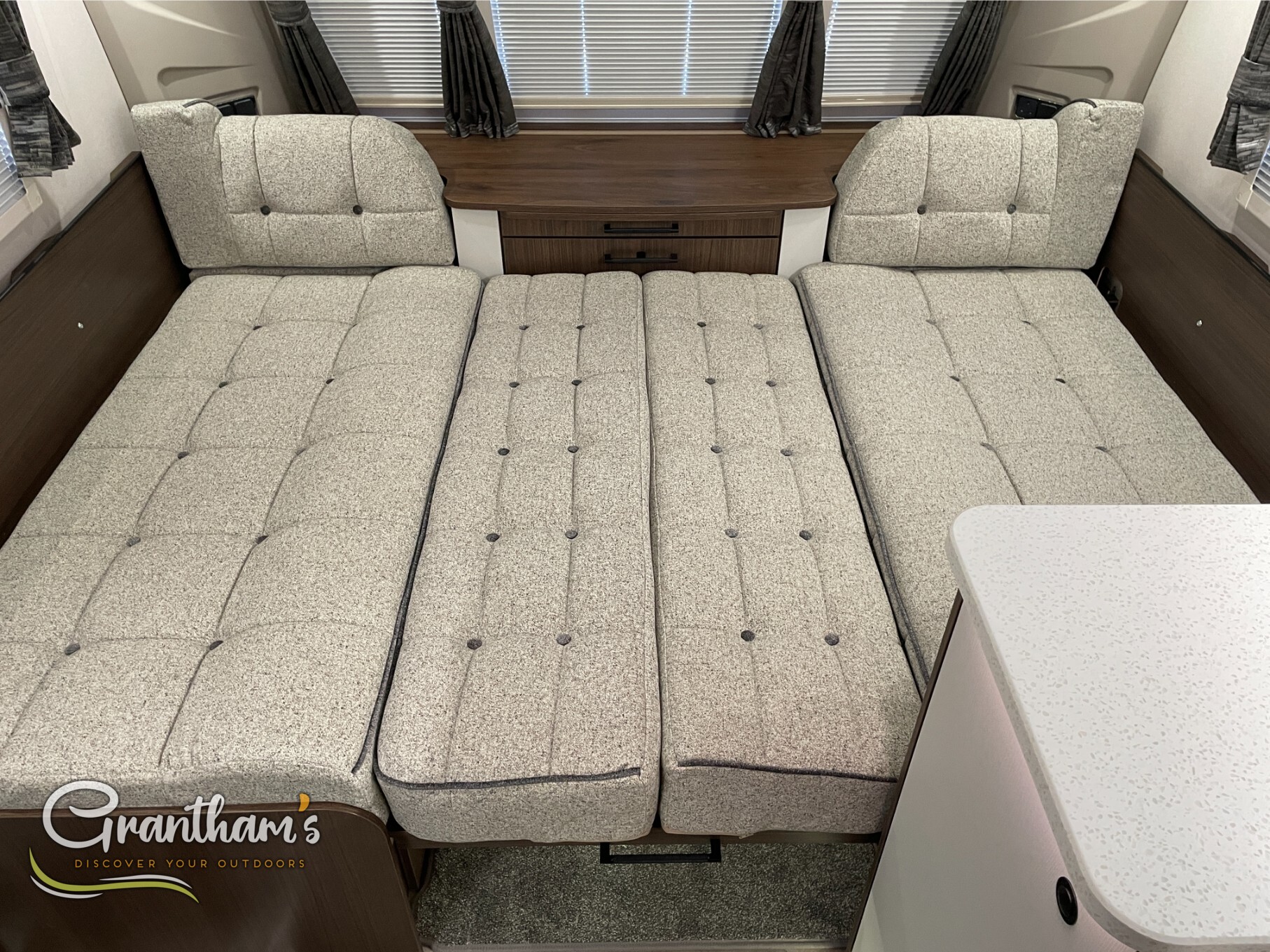 The Coachman Laser 875 Xtra. It’s the more spacious sister of the best selling model the Laser 575 Xtra… What makes it more spacious, well it’s on a twin axle chassis giving it more length allowing for extra luxuries such as a longer kitchen worktop space, extra worktop space near the door with the addition of a under counter storage locker, slightly more worktop space on the corner unit in the bedroom, and of course more floor space. The popular transverse island bed, end washroom layout but bigger.