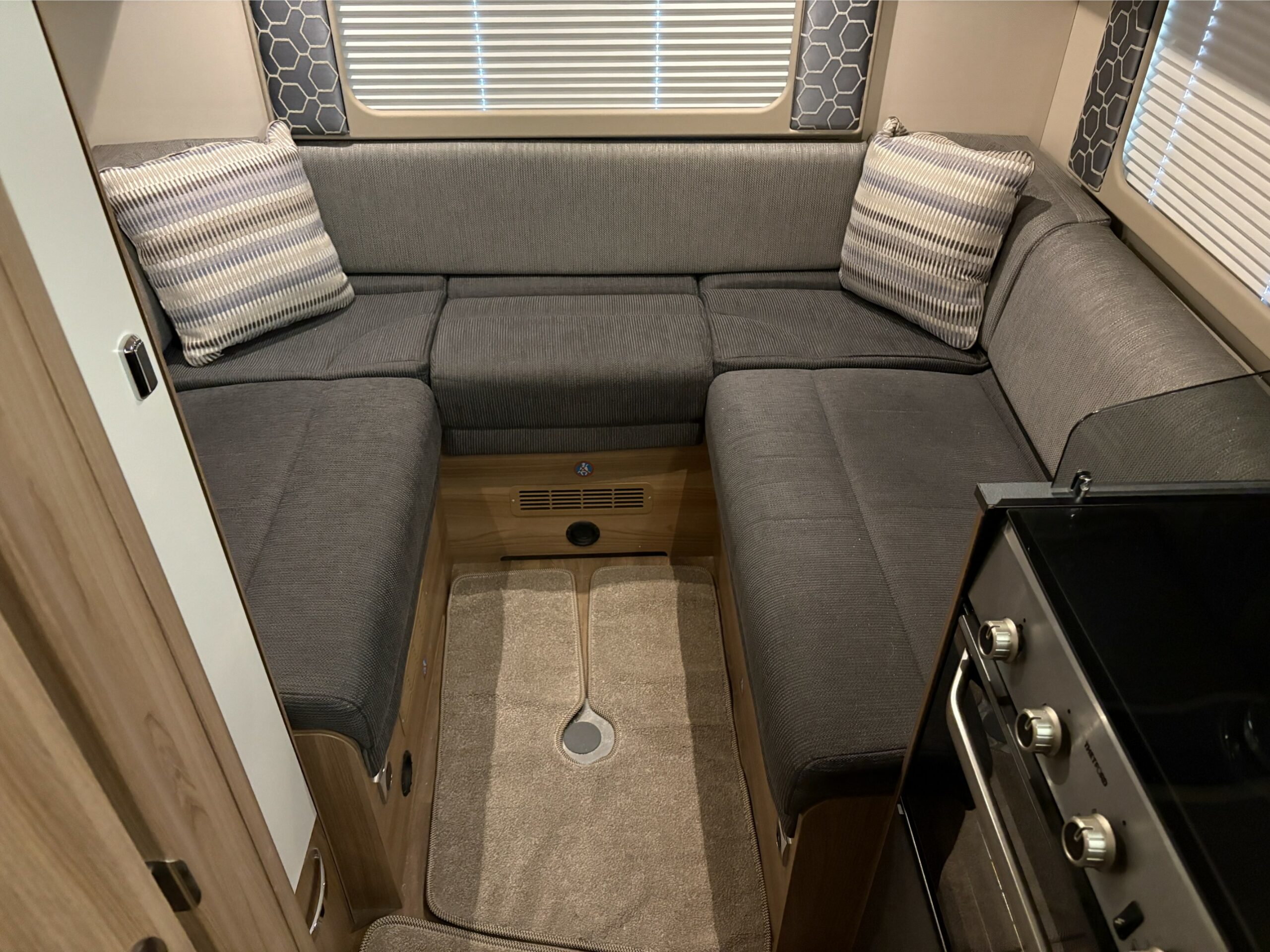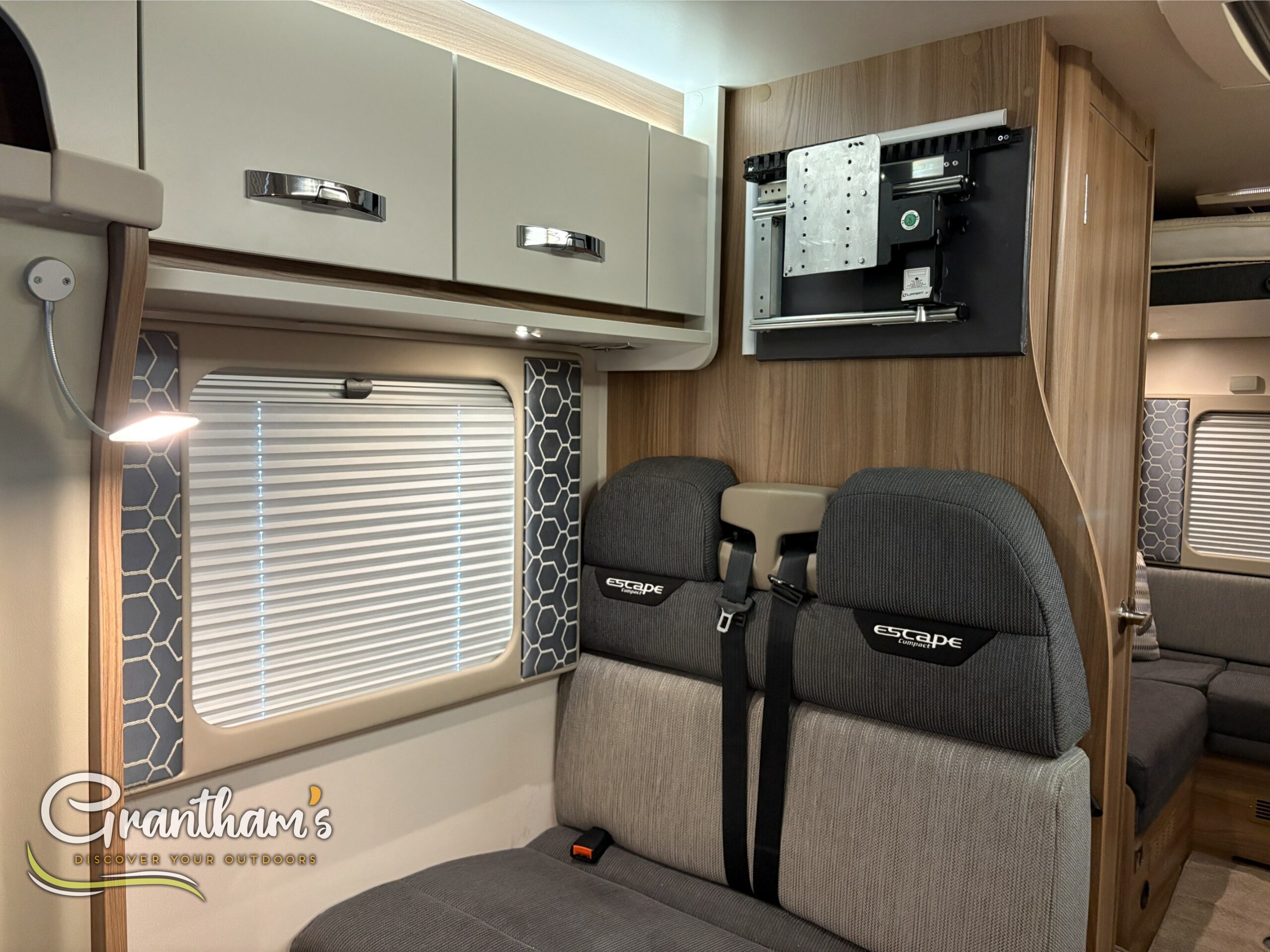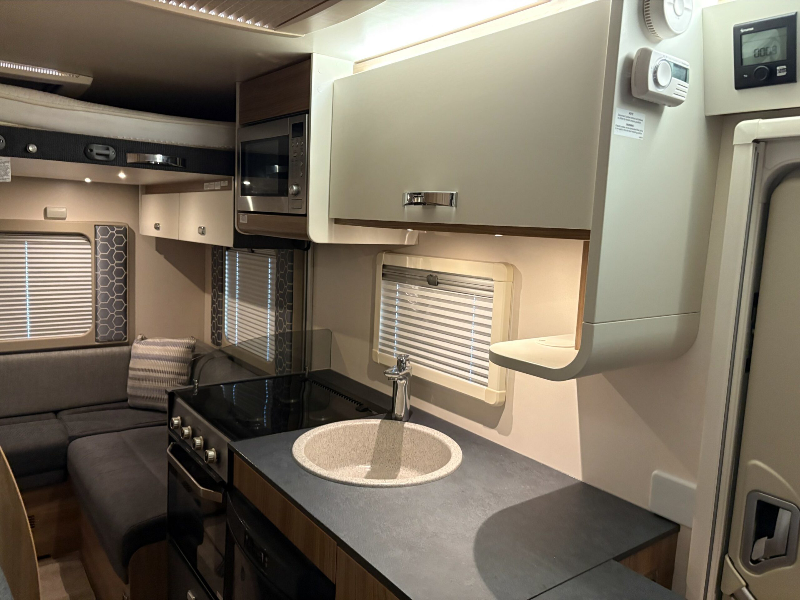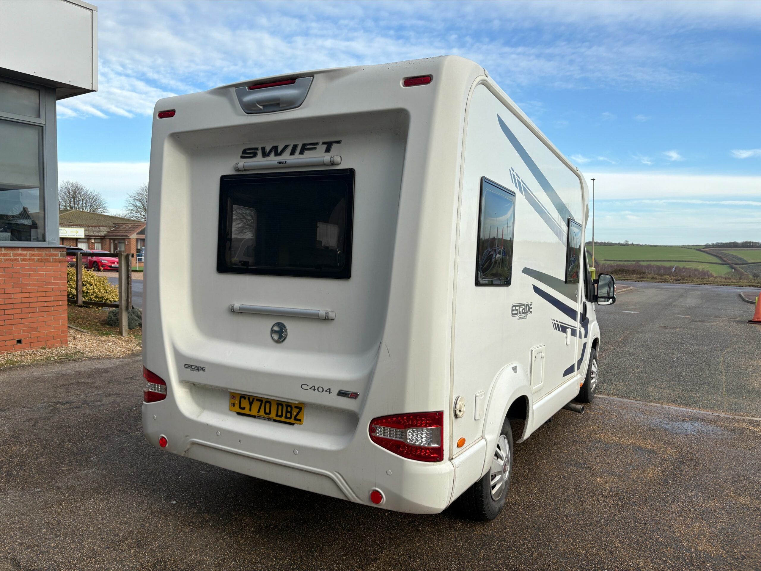 Inside, the C404 feels bright and welcoming, with a spacious lounge that easily transforms for dining or unwinding. The drop-down bed maximises living space without compromising on comfort, while high-quality Swift furnishings add a touch of luxury throughout. The motorhome is equipped with blown-air heating, ensuring warm, cosy evenings all year round. When you’re off-grid, the roof-mounted solar panel helps keep your leisure battery topped up, and the roll-out awning provides instant outdoor shade and shelter—perfect for those long, relaxing afternoons at the campsite.